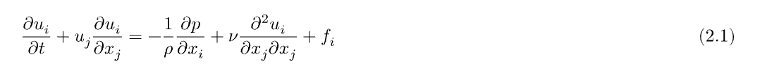 pdv(u_i, t) + u_j pdv(u_i, x_j) = - 1/rho pdv(p, x_i) + nu pdv(u_i, x_j, x_j) + f_i