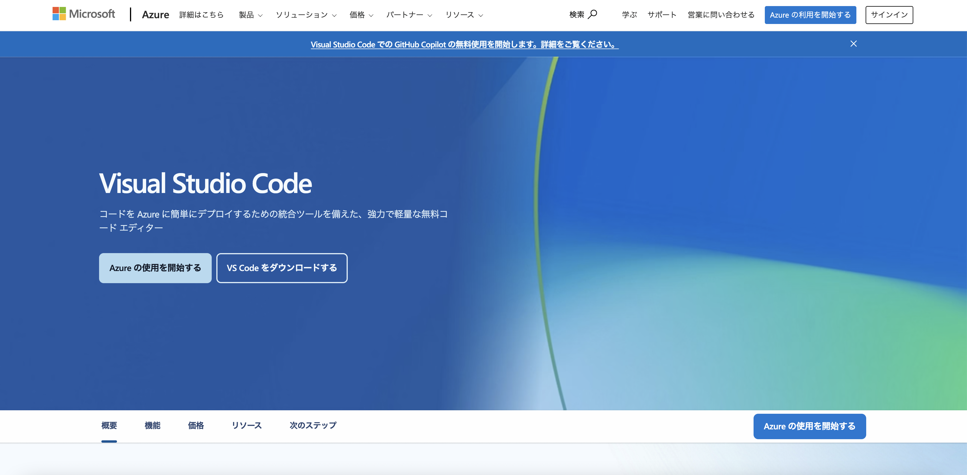 - https://azure.microsoft.com/ja-jp/products/visual-studio-codeにアクセス